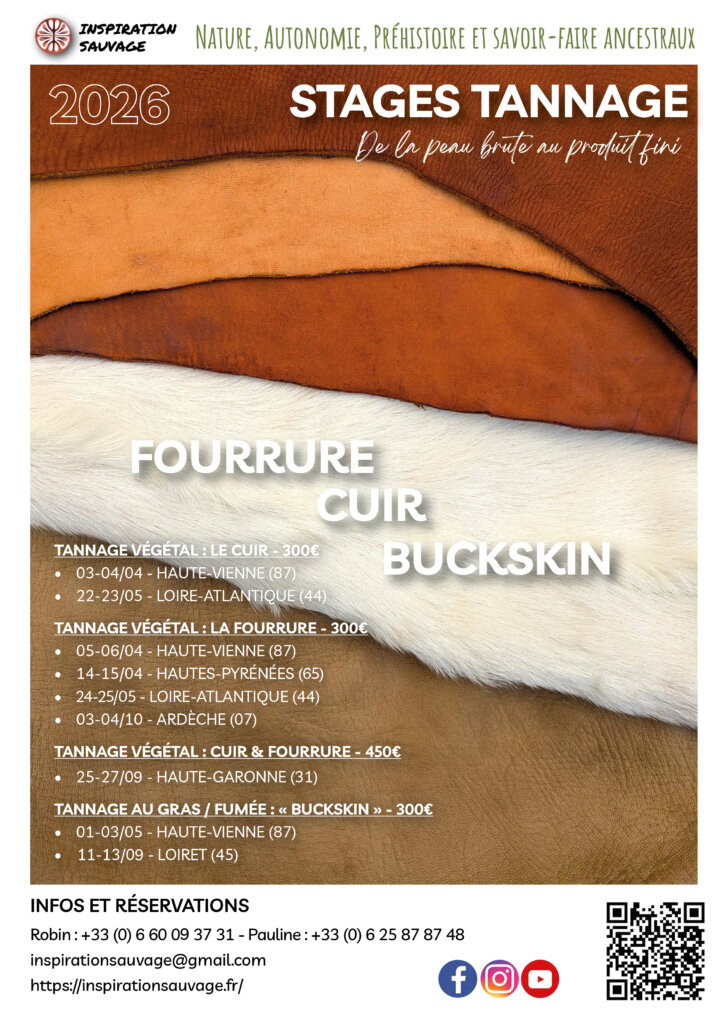 2 ou 3 jours pour apprendre à transformer une peau brute en un matériau noble via des techniques accessibles et demandant peu de moyens. Production de cuir, « buckskin » ou fourrure, en tannage au gras et à la fumée ou en tannage végétal.